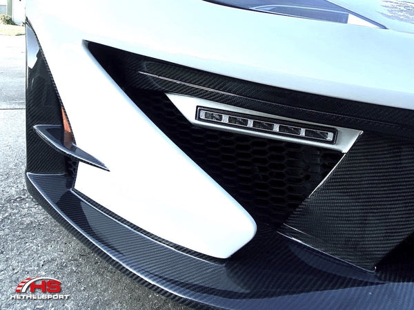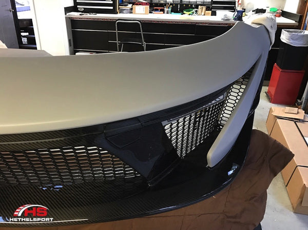 The carbon fiber accents and upper splitter surface are integrated into the bumper. Bumpers include all necessary grilles which are easily removable (prior to bumper installation) for easy prep-&-paint.