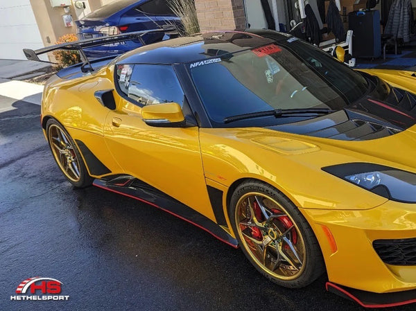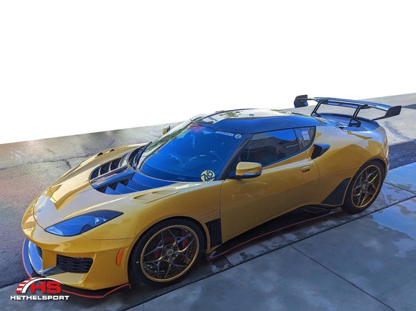 Our GTO Rear Wing was inspired by the modern sedan racing series like Le Mans Cup and World Challenge. This was originally designed for our 410 Engine Cover-Tailgate however, with some adjustments, can be adapted to a factory Lotus louvered tailgate. (See here to identify your tailgate.)