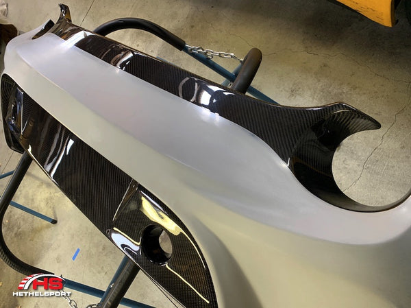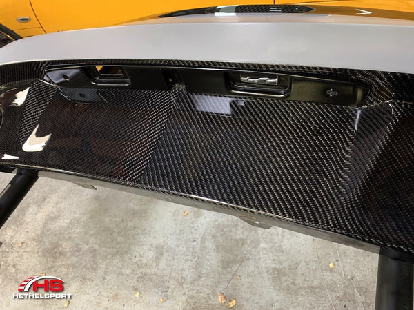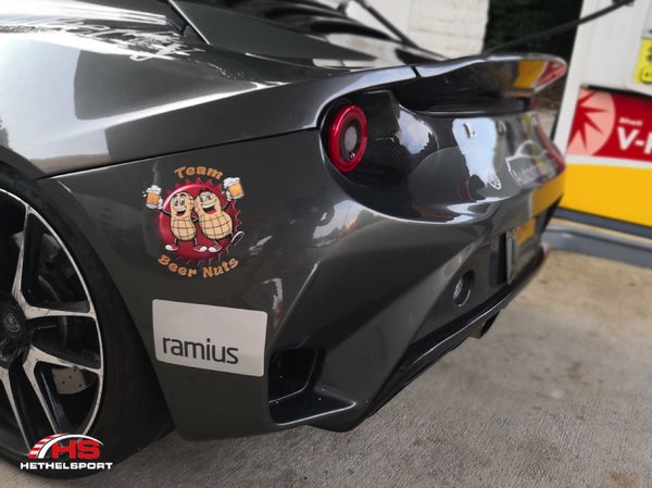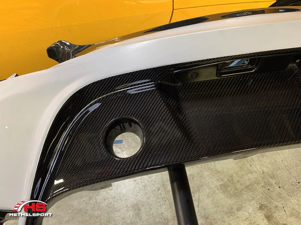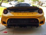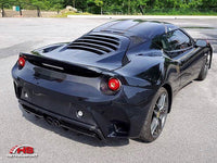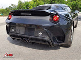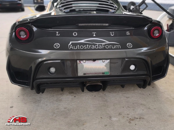 The 430 Rear Bumper includes the rear bumper assembly with carbon fiber overlay center section (between the tail/stop lights), diffuser surround, and a diffuser blade assembly. Tail lights and reverse lights are reused from your original bumper. Your original Evora or Evora S sheet-metal diffuser pan, parking aid sensors, and rear camera are also re-used if equipped. A matching 430 front bumper is also available.